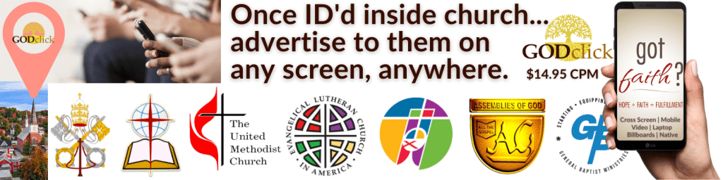 GODclick delivers cross screen ads ONLY to Churchgoers via location tech + filled USA churches. Faith applications: Admissions, Politicians, Products.