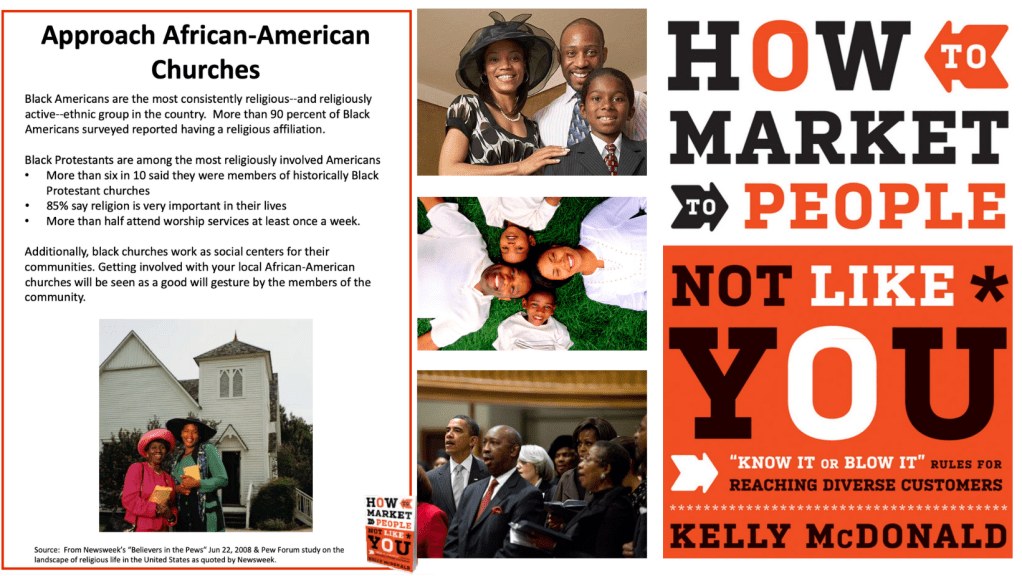 “KNOW IT or BLOW IT” rules by Kelly McDonald in “How to Market to People Not Like You”: Rule #1: “Approach African-American Churches“*. Pew Research Center adds: “Black Churches have done a ‘great deal’ to help black people move toward equality in U.S.”*