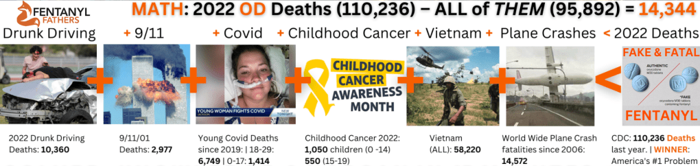 2021 and 2022 became successive record years for overdose deaths. There is no precedent to even hyperbolically describe how bad it’s become. Here’s a perspective comparison of death toll number facts: Take all of last year’s childhood cancer deaths and drunk driving deaths, add all Covid Pandemic deaths ever under age 40, all deaths total in Vietnam, 9/11, and all deaths total on every airline crash since the Wright Brothers, and you still come up short compared to how many Americans fatally overdosed in 2022: 110,236 according to the CDC – another record high! Most of them quite young, and the vast majority from Fentanyl.