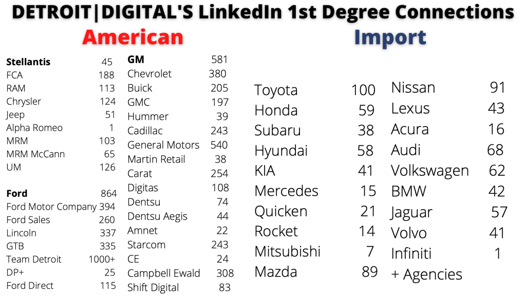 Page 4 of My Deck (screen shot below) summarizes how out of my 5,321 first degree LinkedIn connections, I have 100s of first degree connections to every American OEM and dozens of first degree connections to Import Automotive clients.