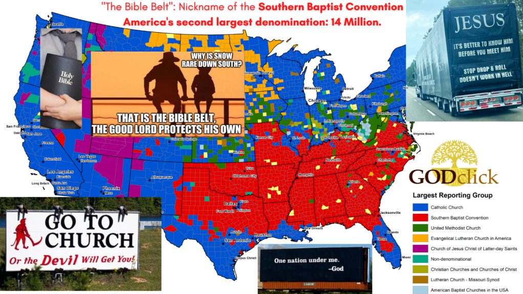 #2 Denonination in the USA. Congregations 47,592 | Members 14,089,947 | Weekly attendance 4,439,797 | Official website: sbc.net | MASSIVE – See red on map below.