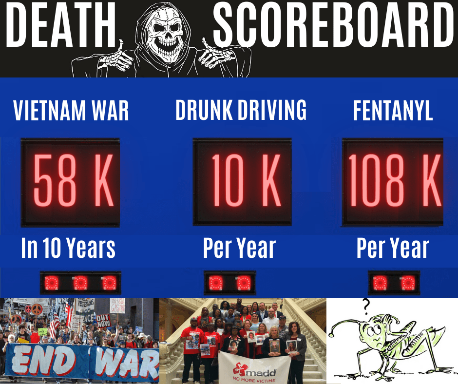 SHHHH. The great SILENCER: FENTANYL. I am more apt to believe I’m Rod Serling narrating “The Twilight Zone” or Ingrid Bergman starring in “Gaslight”. WAR brought out the unified, noble idealists that demanded we STOP! We did. Drunk Driving made nearly all mothers so MADD they demanded justice. They got it. So when Fentanyl kills 10 to 20 times as many as those two – per year, we hire Jiminy Cricket as a spokesperson. I’m lost.