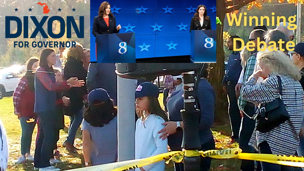 With arms wide open (below), sporting a flannel shirt and blue jeans, Tudor Dixon (left) waits her turn along with her daughters for her name to be called up onto stage for a Cider Mill Rally on 10-22-22. Her debate knockout punch? Pointing out Gretchen was caught on video kneeling with Police Defunders. Tudor wants to invest $1B in Police. Some amateur clips I took: