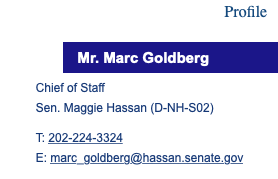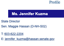 Example below using Senator Hassan – I’ll list 3 key people posted under each name.